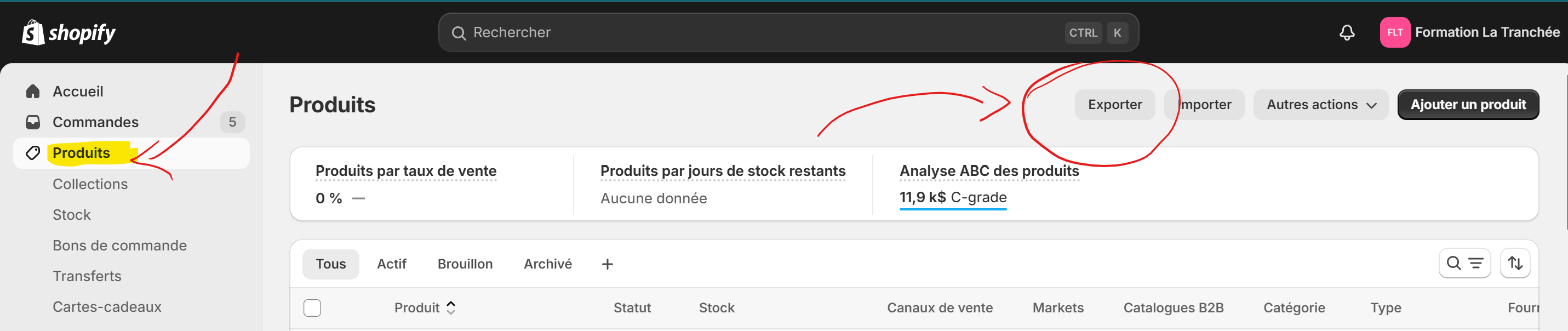 Si tu as déjà une liste de tes produits à quelque part, c’est super, tu peux l’utiliser pour faire le tri, sinon tu peux exporter la liste de tes produits dans Shopify en cliquant sur “Exporter” dans le haut à droite à partir de l’onglet “Produits”: