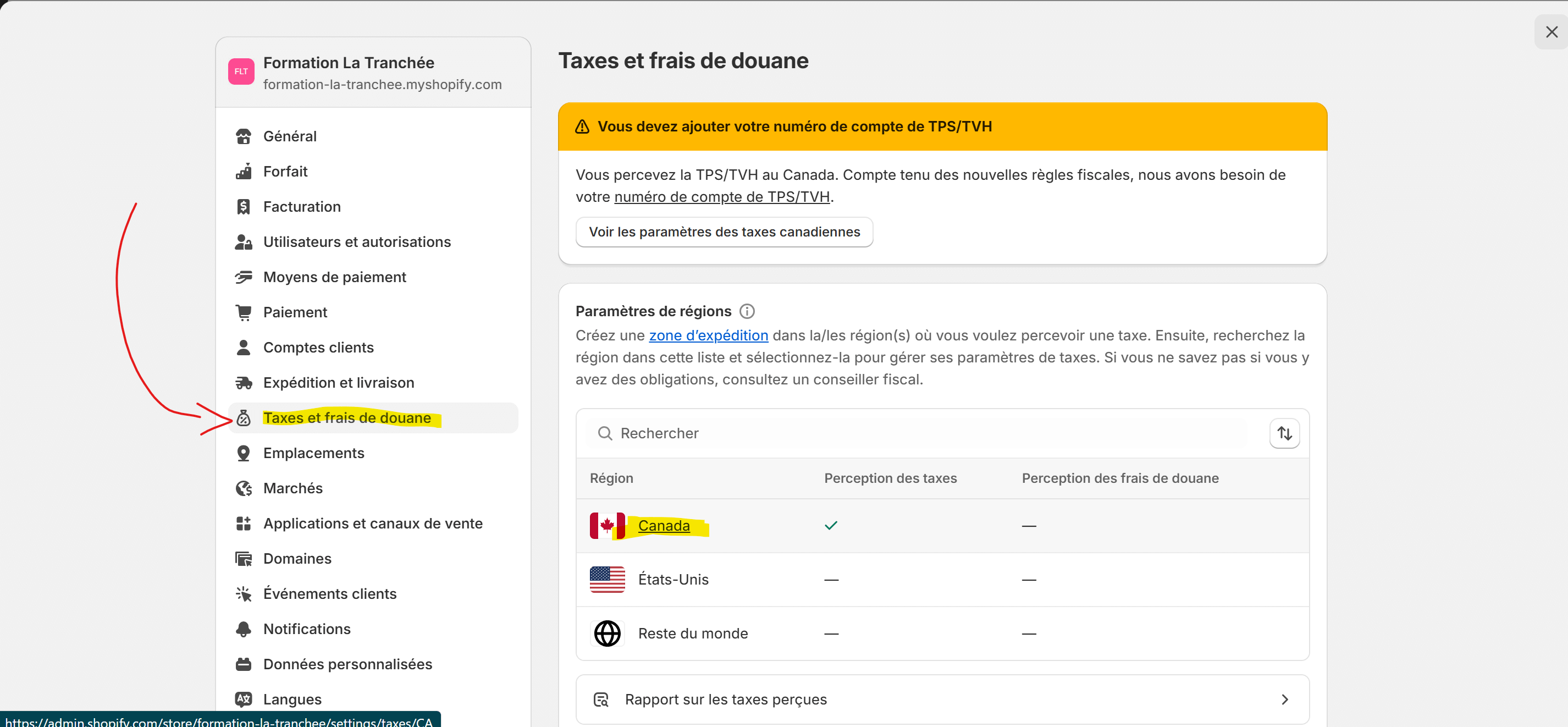 Dans le tableau de bord Shopify, rends-toi dans > « Paramètres » (icône d’engrenage dans le bas à gauche) > « Taxes et frais de douane« , et sélectionne la région “Canada”.