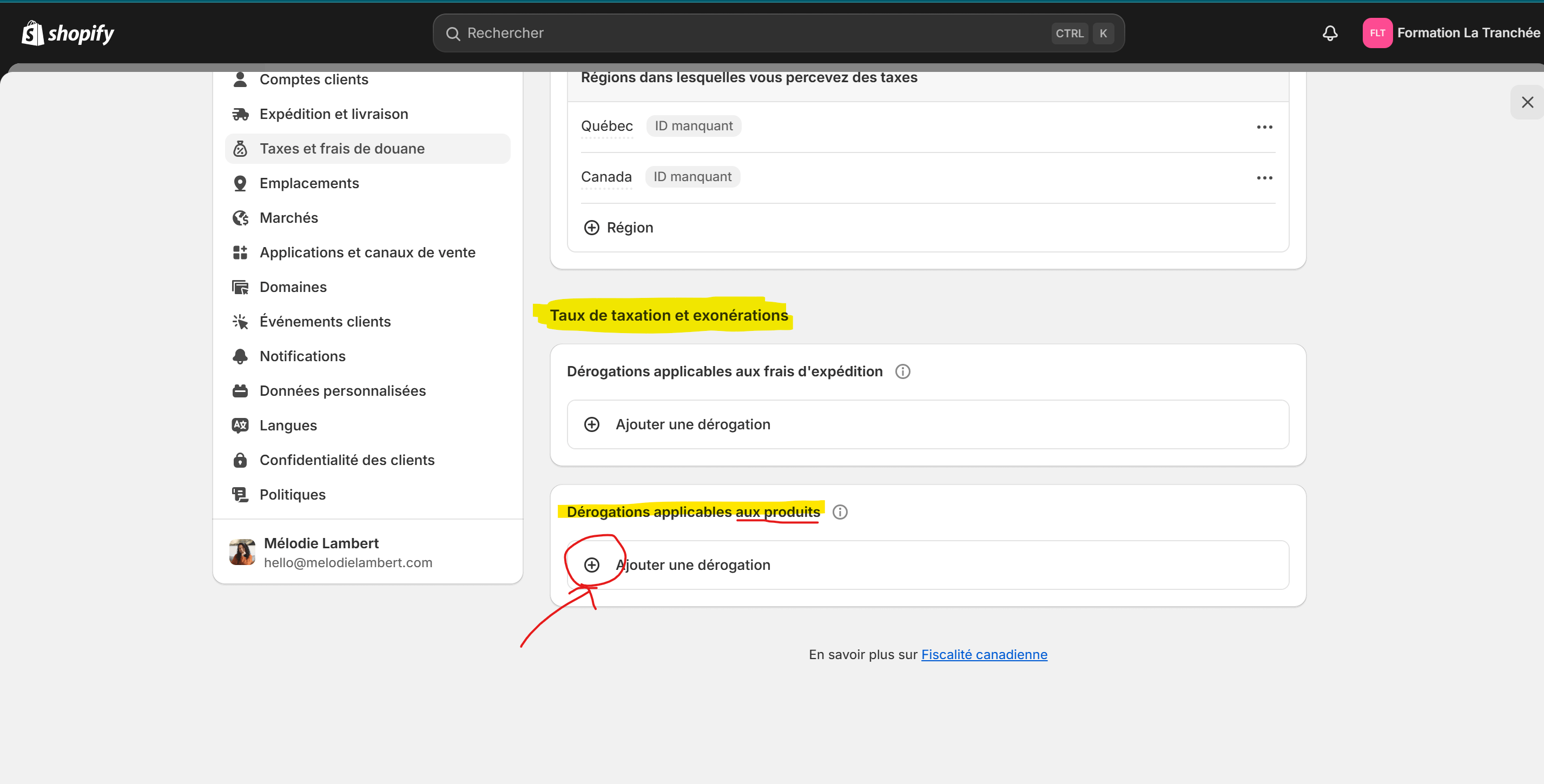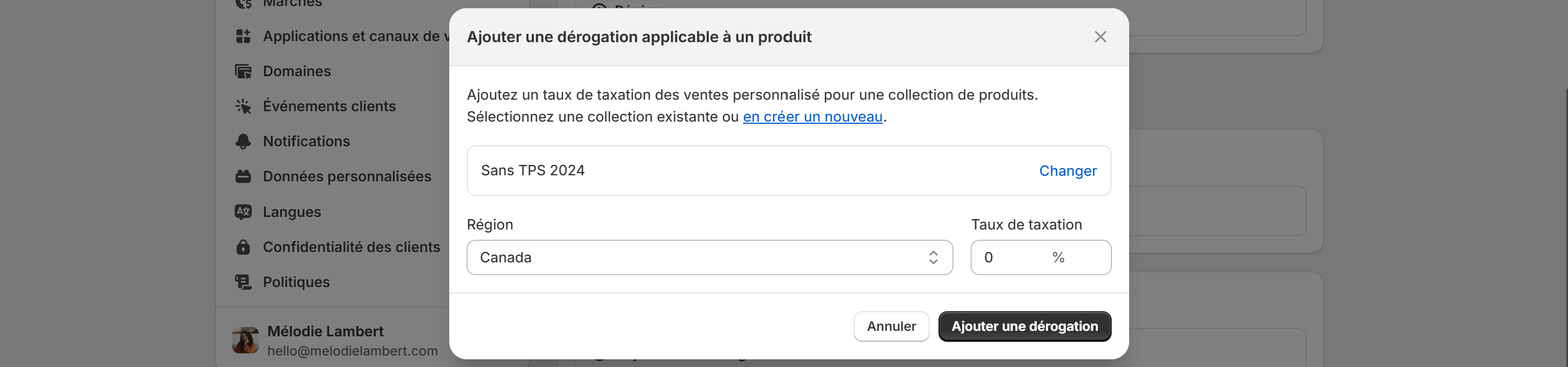 Sélectionne la collection qui regroupe tous les produits concernés, et sélectionne “Canada” (qui gère la TPS) et règle ça à 0%. Clique sur “Ajouter une dérogation”.
