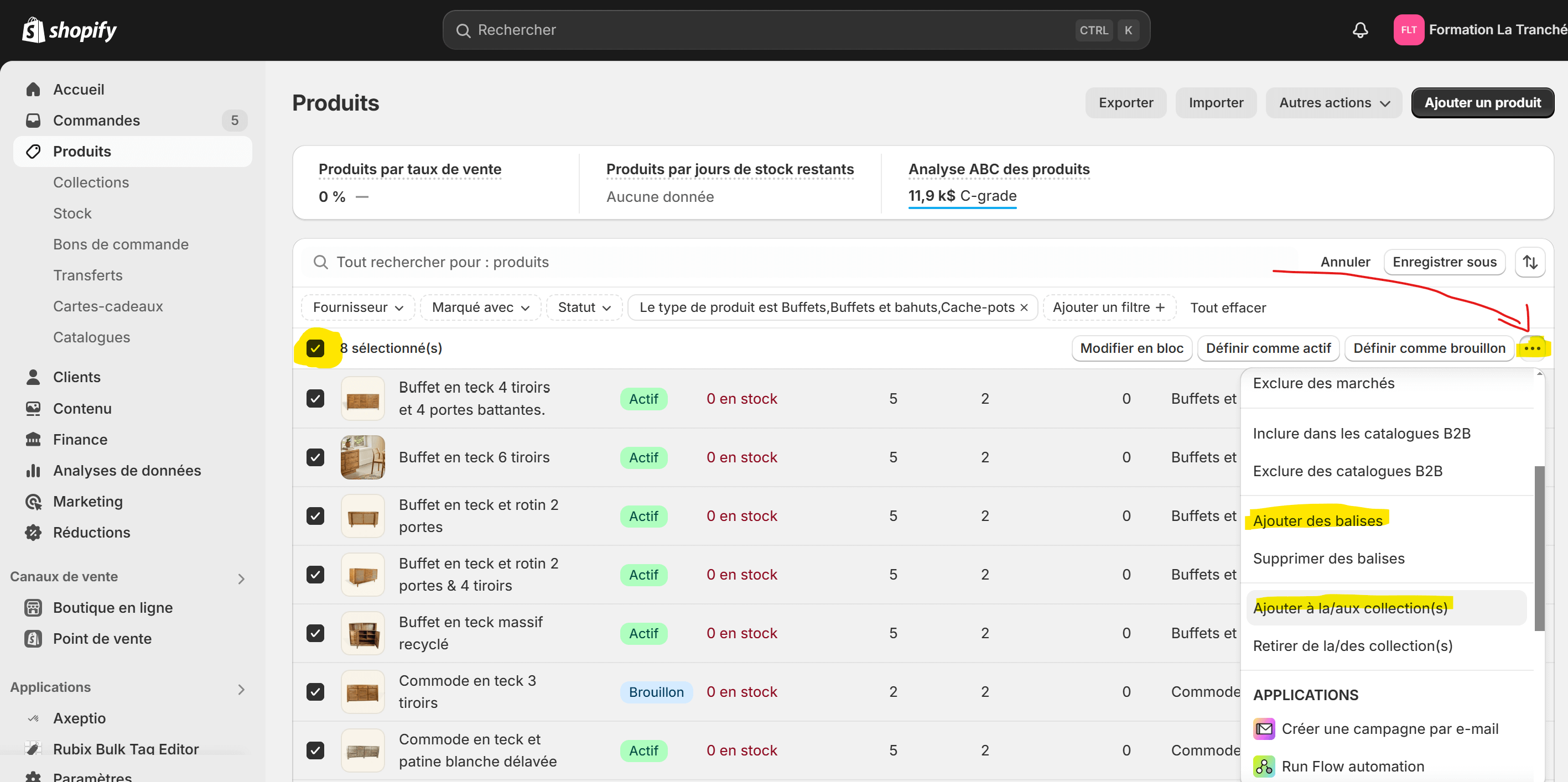 D’abord, identifie TOUS les produits concernés que tu vends dans ta boutique.