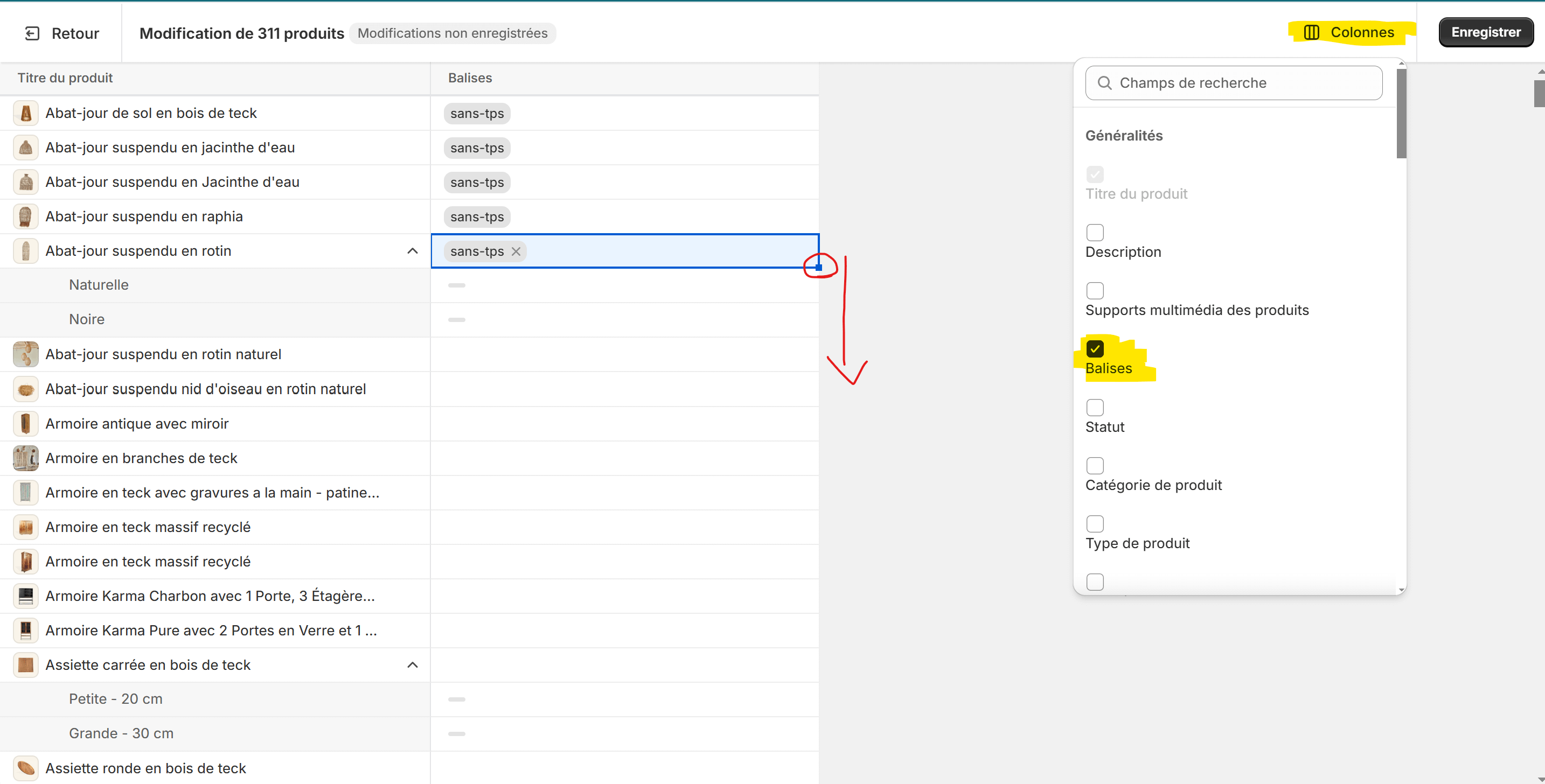 On encore, au même endroit, mais dans la vue « Modifier en bloc ». C’est beaucoup plus rapide que d’y aller à partir de la fiche produit, par contre, à moins que tout soit déjà bien catégorisé par “Type”, il va falloir aller chercher manuellement les produits ou recréer des vues filtrées à chaque catégorie. C’est faisable, mais avec trop de produits, ça devient plus complexe pour s’assurer que rien ne passe par les trous du filet.